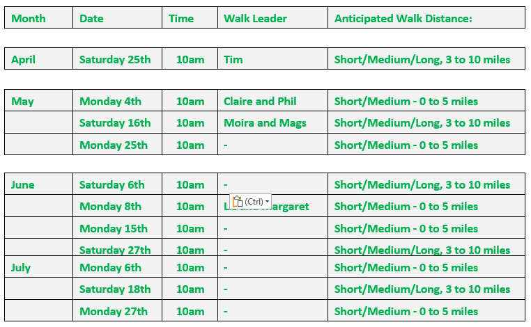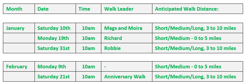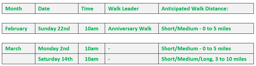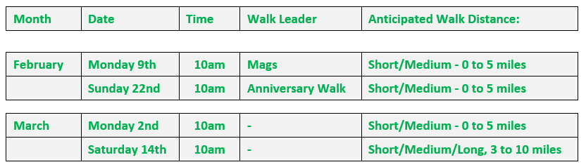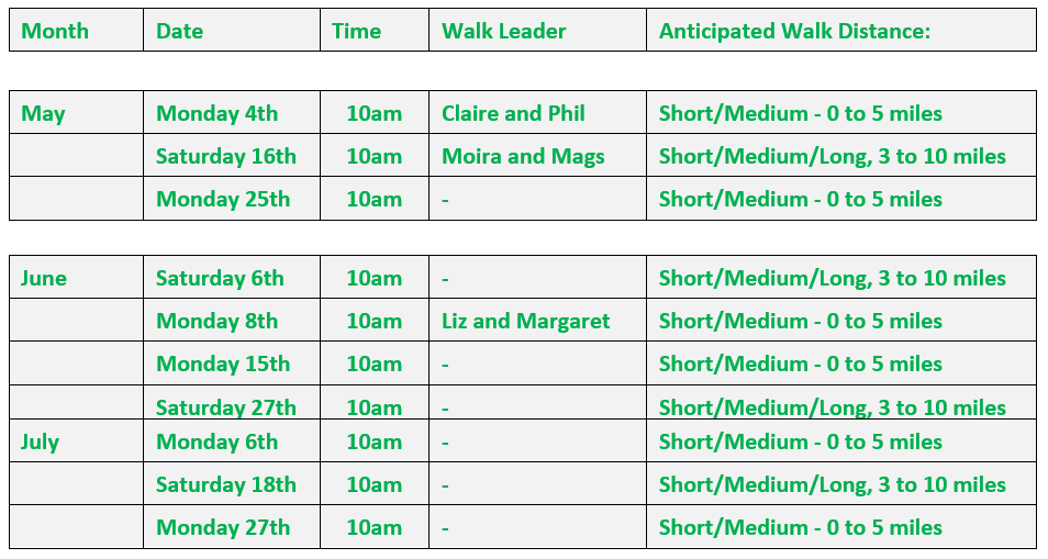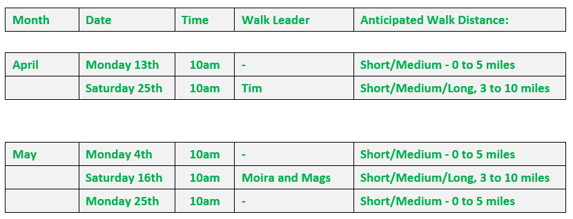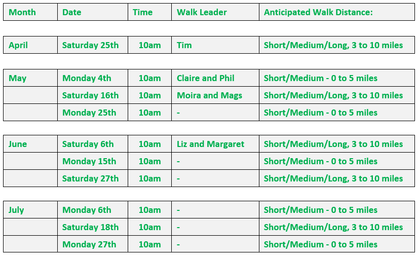 Dates: Confirmed walk dates/time, leader and anticipated walk distance are shown below: