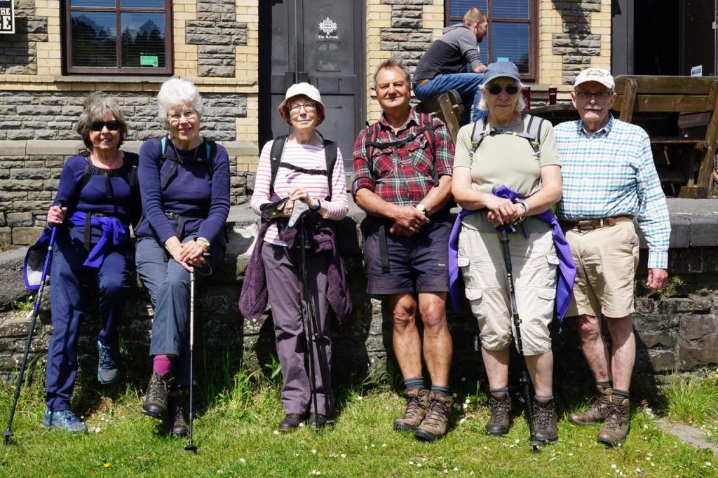 Unlike on our previous visit the carpark at Afan Argoed was busy with both cyclists and walkers and we six swelled the numbers of the latter as we set off down the hill to cross the river Afan. A rather grey morning was beginning to lighten and warm up as we followed a delightful path upstream, leaving the river far below but with the tumbling waters still in earshot. The shade afforded by the fresh spring leaves of the huge trees took the edge off the building heat of the day but, after about a mile and faced with a steep climb, some of us stowed our jackets whilst others were forced to remove items of clothing on the actual ascent. Welcome relief at the top for a coffee stop and a retelling by Robbie of a stressful end to a recent walk reconnoitre.