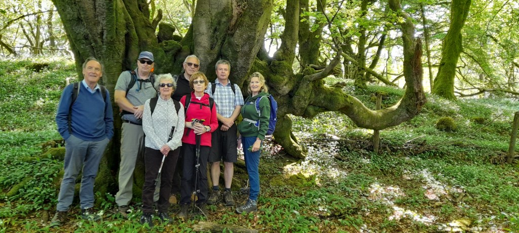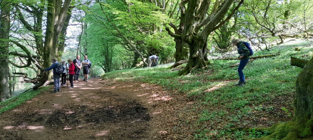 We now began the long uphill stretch taking us past the big ventilation shafts for the Caerphilly to Cardiff railway tunnel and finally up onto the ridge providing lovely views northwards to Caerphilly and beyond. We sat having our lunch on a warm bank inside a large old disused limestone quarry. So nice to experience warmth once again on our bodies! The next stage of the walk took us through the ancient beech woodland carpeted with wild garlic until we reached the busy main Cardiff/Caerphilly road close to the Travellers Rest.