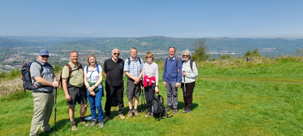 Eight of us set out from the Village Hall at 10am in two cars and made our way to the big carpark close to the top of Caerphilly Mountain, setting off just before 11am. The day was the sunniest and warmest day of the year to date and soon items of clothing were being shedded. The walk first took us steadily downhill until we reached the Caerphilly to Rudry road where we could see a lone chimney stack in a builder’s yard, close to where the Wern Ddu Colliery used to be.