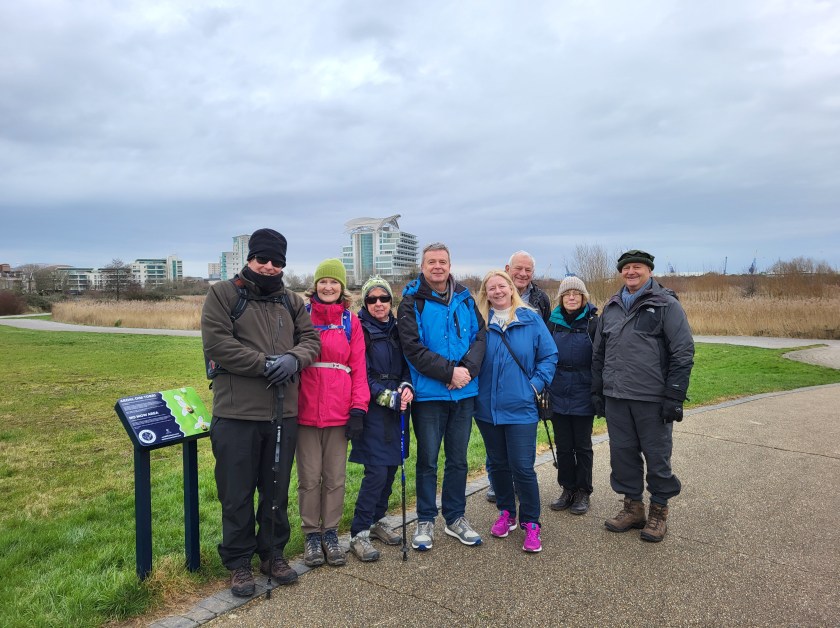 Nine Wanderers headed off from the Village Hall and parked in Penarth at the free car park by the marina. Although chilly the weather was dry, and the rain held off for the whole walk. I had double checked online that the barrage would be open after the unexpected problem with its closure on our recce attempt, and we headed in that direction to commence the walk. We made quite slow progress on the first section of the walk across the barrage. Phil, who used to work for the Harbour Authority in the Bay, was so knowledgeable and pointed out many things to us that we would have missed without him in the group. Who knew that what seemed to be random yellow lines painted on concrete were in fact an art installation when you know where to stand?