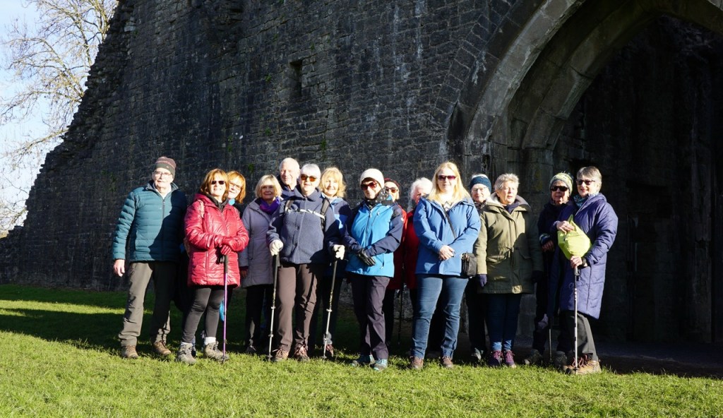Then we headed out of town, noticing all the leaf tips of bulbs pushing their way through the soil. After the snowdrops there will soon be a lovely display of spring flowers. The route climbed upwards, and we soon reached the ruins of St Quentin’s 14th Century Castle. The views were lovely on this bright sunny winter’s day. Our resident photographer lined us up against the castle backdrop for our group photo.