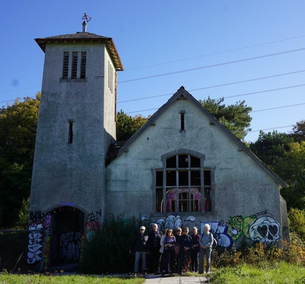 We parked down by the beach where the sea was a glorious calm blue and the sun shining very promisingly. Walking back inland we soon came to a little bridge leading to a lovely stretch of path through a wooded area, eventually coming to some fields and a beautiful old pink farmhouse, where nearby were some attractive holiday cottages. All the time the PowerStation was just behind us providing an interesting back-cloth to our walk. We continued along quiet roads until we reached the Boys Village at Aberthaw, an interesting set of very derelict buildings and a fascinating old chapel, where we all decided that money should ideally be put in to bring the chapel back to life.