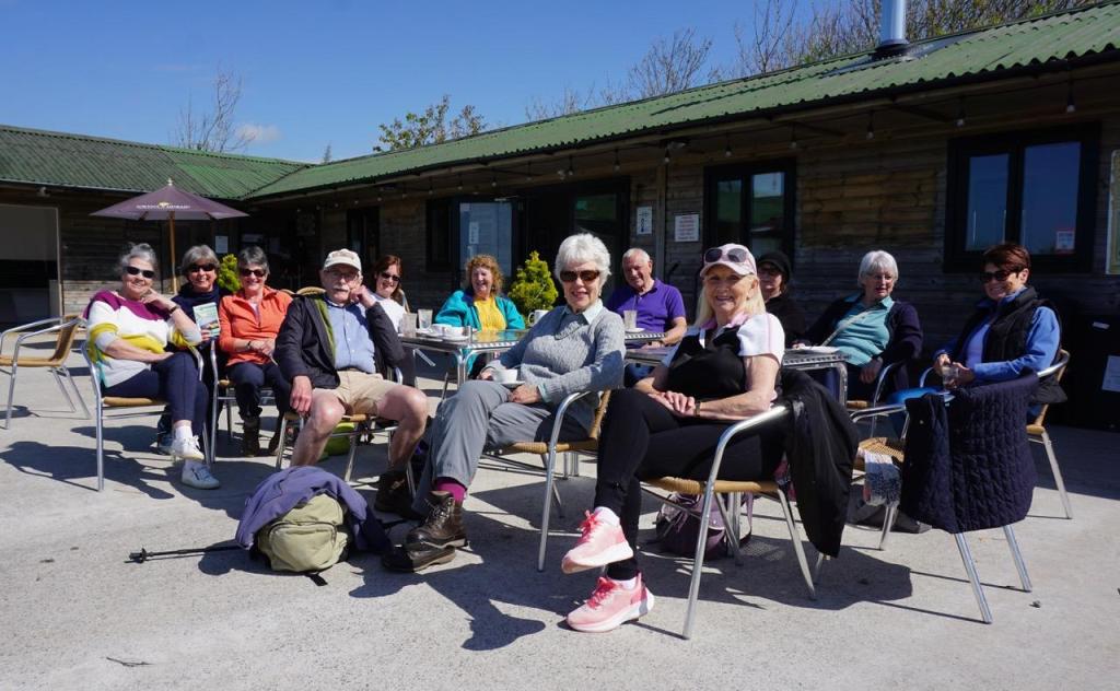 Passing by The Plough n Harrow, we arrived at our destination, The Heritage Camp Site, and much anticipated /tea/coffee/hot chocolate (with swirly cream atop!) Sitting in the sunshine, enjoying the refreshments and lively banter, we reflected on our good fortune. Here, WWs resident photographer, lined us up for a group pic.