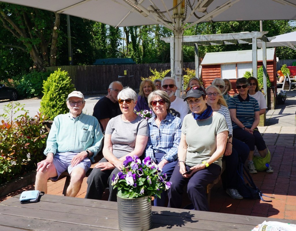 We had our group photo sitting outside the Harvester in the sunshine, thank you Graham, and refreshments eventually arrived but unfortunately no cake. Thank you for back marking Richard and thanks to all friends for coming on this walk.