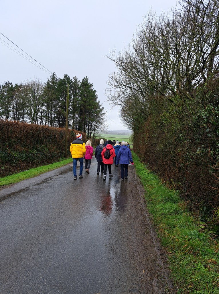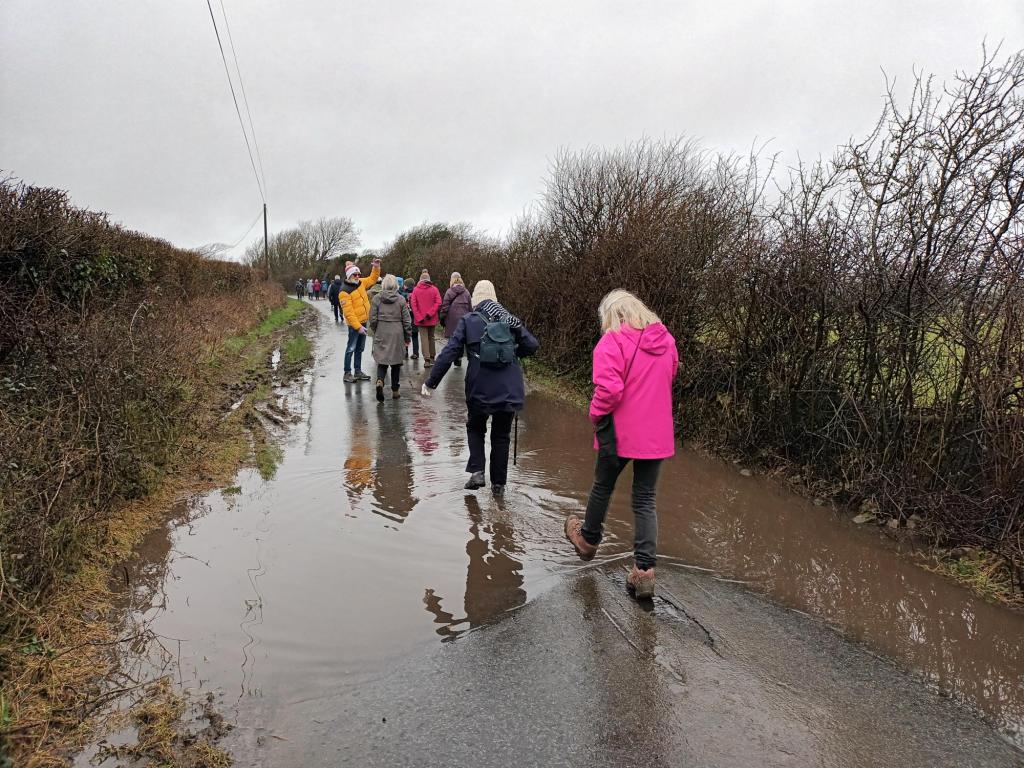 Before setting off on the walk, a photo was taken outside Wick Village Hall, which has been the traditional starting point of all walks and this replicated the photo taken on the original walk. The walk was approximately 3 miles, mostly on road due to the weather conditions, however the group did have to contend with some flooded areas en-route.